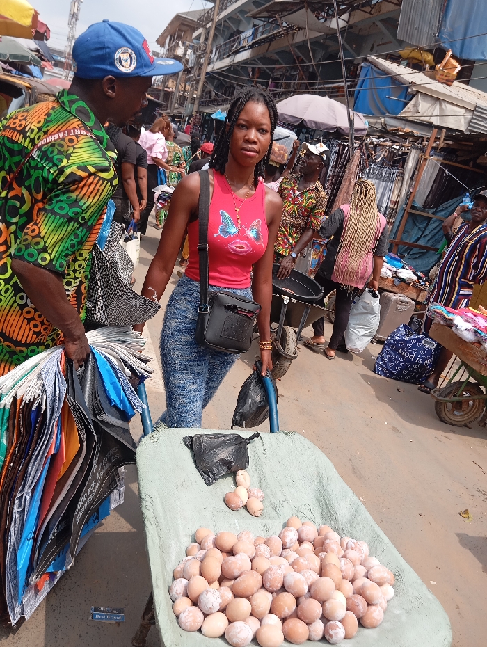 A bustling market scene features a young woman in a red tank top and jeans pulling a wheelbarrow laden with eggs