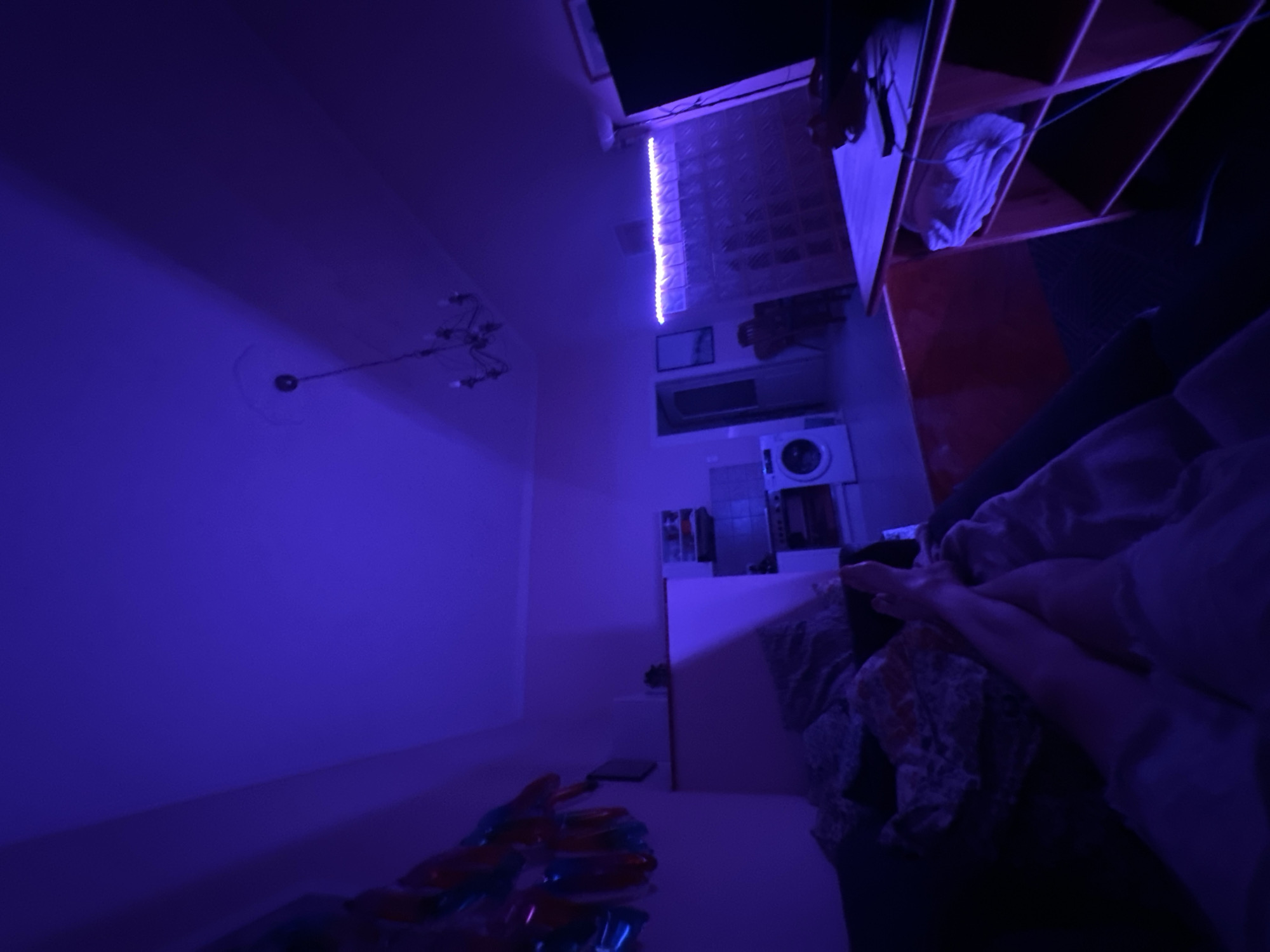The image depicts the interior of an apartment in Budapest, Hungary, rendered under predominant purple-blue artificial light. The perspective is from a reclining individual whose crossed legs and feet, clad in light-colored fabric, are visible in the lower-left foreground. The individual is positioned on a dark sofa or bed, partially covered with patterned bedding. To the left, against a wall, multiple deflated, metallic-sheen balloons (red, blue, silver, gold) are affixed. A partial room divider or wall separates the living area from a functional kitchen space in the mid-background, which contains a white washing machine, a stove, and shelving with various items. Further back, a dark wooden table and chairs are partially visible near a doorway. To the right of the reclining individual, a dark wooden desk with internal shelving is present. Its surface holds a dark electronic device, likely a monitor or laptop, and a smartphone. A white cloth rests on a lower shelf of the desk. Above a patterned wall or room divider in the mid-background, a horizontal purple LED strip provides directed illumination. The ceiling features a central chandelier and a simpler light fixture on the left. Shadows are significant due to the concentrated lighting.