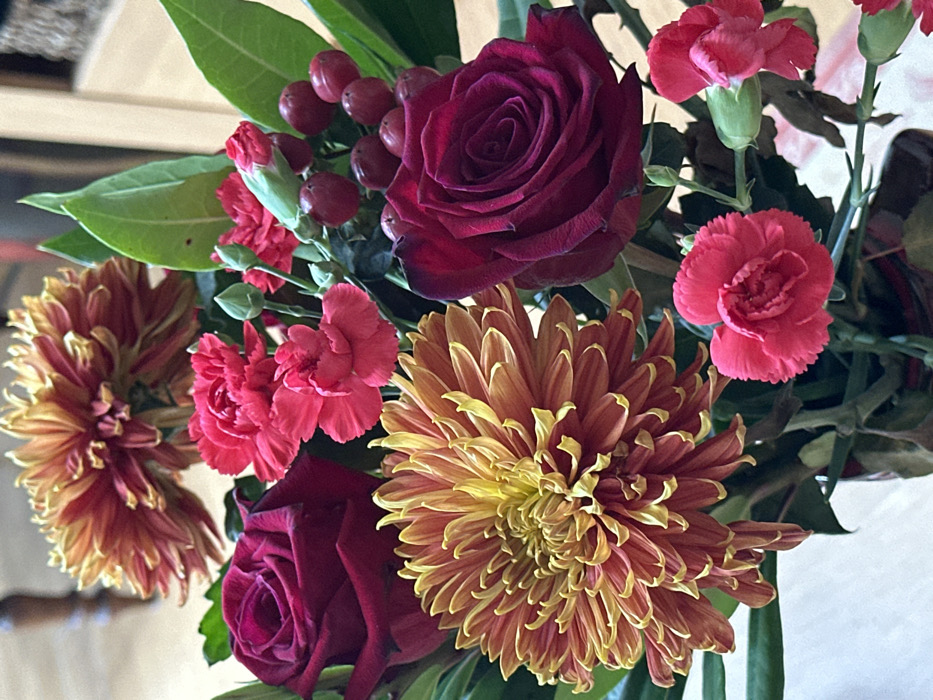 The image displays a detailed, close-up perspective of a fresh floral bouquet, presented indoors. The arrangement is densely packed, featuring multiple flower types and foliage. Dominant elements include large, multi-petaled chrysanthemums with petals transitioning from deep orange to yellow at their centers; two of these are prominently positioned in the upper-left and lower-center of the frame. Several deep red roses with tightly spiraled petals are visible, one on the mid-left and another on the mid-right. Bright pink-red carnations, characterized by their frilly petals, are interspersed throughout the bouquet. Small clusters of round, red berries are present, primarily on the right side, alongside assorted green foliage and unopen green flower buds. The background is significantly blurred, indicating an out-of-focus indoor environment with indistinct light-colored surfaces and a dark wooden element visible in the upper-left background. No individuals are depicted. The specific location within the city of Wealden, United Kingdom, cannot be identified from the visual data.