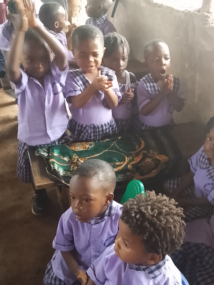 A group of young children, likely in a classroom setting, wear similar light purple shirts and checkered skirts or shorts. Some children stand and clap their hands enthusiastically, while others sit and observe. A decorative green cloth rests on a bench or table, and a green plastic object is visible among the seated children. The overall atmosphere seems positive and engaging.