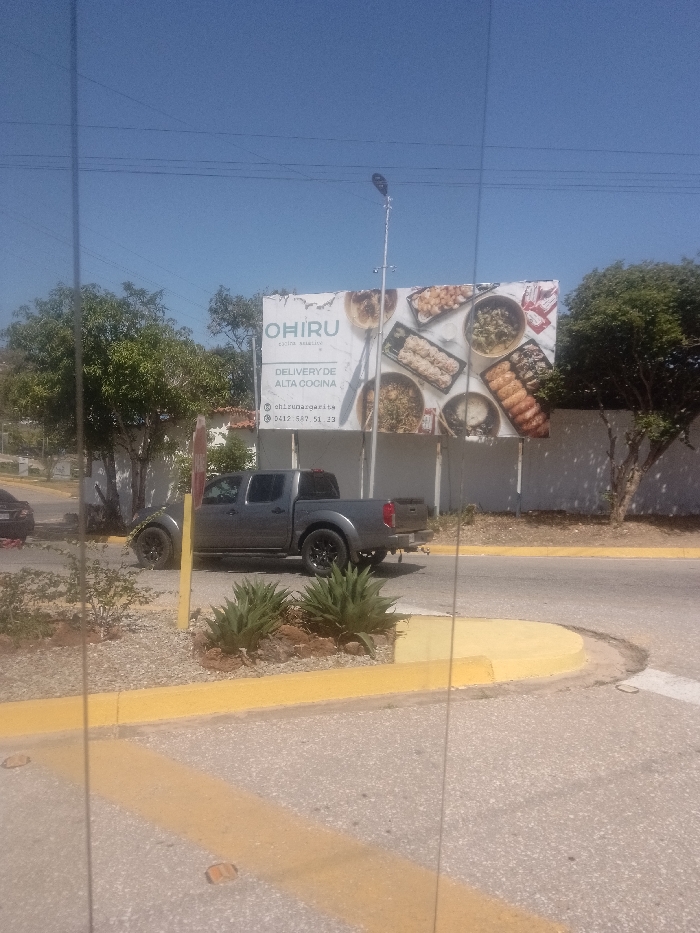 The scene depicts an outdoor urban or suburban environment under a clear blue sky. A large billboard occupies the central-right portion of the image, displaying "OHIRU cocina asiatique," "DELIVERY DE ALTA COCINA," an Instagram handle "@ohirumargarita," and a phone number "0412 587 51 23." The billboard showcases multiple images of Asian cuisine, including sushi rolls and various bowl dishes. Below the billboard, a dark grey four-door pickup truck, possibly a Nissan Frontier, is parked on a paved surface, facing left. The truck features black wheels. To the far left, a portion of another dark-colored vehicle is visible. A light-colored pole with a street light fixture stands in front of the billboard. The foreground features a grey asphalt road with a yellow painted curb and a landscaped median strip containing small green agave-like plants and reddish-brown rocks. Behind the parked truck and billboard, a white wall is visible, along with several green trees and shrubs. A building with a terracotta-colored roof is partially visible through the trees on the left side of the frame. Thin utility wires traverse the clear blue sky. No individuals are visible in the image. The location is in the city of Unknown, Unknown.