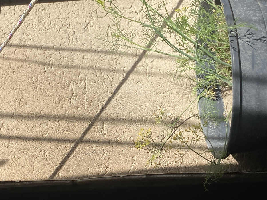 A close-up shows dill growing in a black pot, placed on a ledge. Sunlight casts shadows across the textured beige wall behind the plant. A thin, multicolored rope is visible in the upper left corner. The plant's feathery leaves extend towards the light, some flowering with tiny yellow blossoms. The pot occupies the right side of the image, partially cropped out.