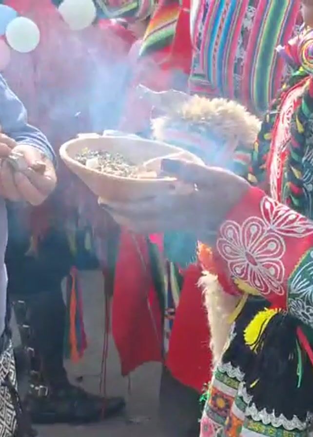 woman in traditional Andean clothing holding a smoking bowl out to another woman. The second woman is holding her hands over the bowl. There are other people in the background, some also wearing traditional clothing. There is a canopy in the background.