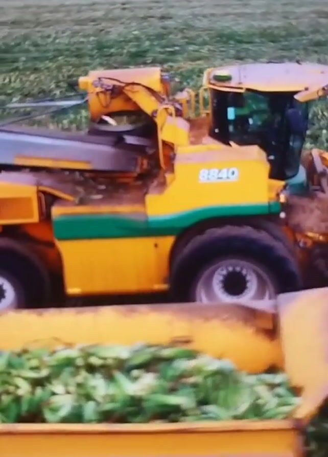 green bean harvester moving across a field, gathering green beans into a trailer. The harvester is yellow and green and labeled "8840". The trailer is partially filled with green beans. The field is green and brown. The sky is blue. The camera is unstable.