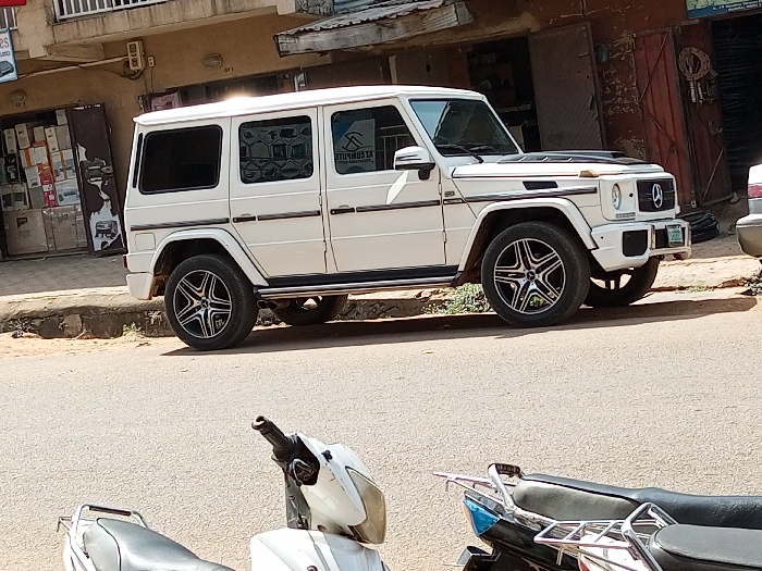 An outdoor daytime scene in Shaba, Nigeria, depicts a white Mercedes-Benz G-Wagen SUV parked parallel to a concrete curb on a paved street