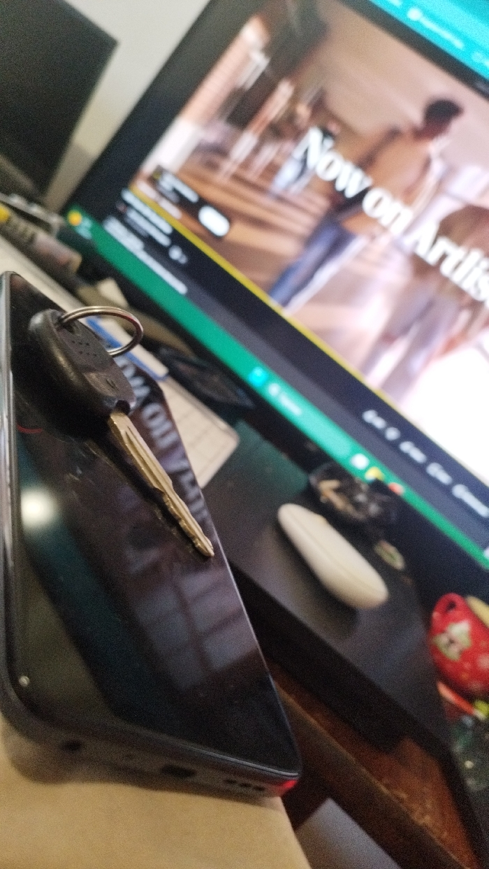 The image depicts an indoor scene, likely a workstation or desk environment, in an unknown location. In the immediate foreground, a black smartphone, encased in a dark protective cover, rests on a light-colored, possibly tan, surface. A silver-bladed car key with a black plastic head is positioned on the smartphone's screen, connected to a silver split ring. Underneath the key and partially obscured, a paper document with the visible letters "OH" is present. In the mid-ground, a dark surface, consistent with a desk or table, extends behind the smartphone. Further in the background, a monitor or laptop screen is visible, displaying active media content. The screen prominently shows the text "Now on Arti..." (likely "Now on Artlist") superimposed over a blurred visual featuring figures, including a male in a light-colored top and dark pants. A green progress bar or timeline, along with other user interface elements such as white circular indicators, is visible at the bottom of the screen display. To the right on the dark surface, a white, elongated, oval-shaped object (resembling a computer mouse) and a small, red, patterned container with a handle are partially visible. The scene is illuminated by ambient lighting.