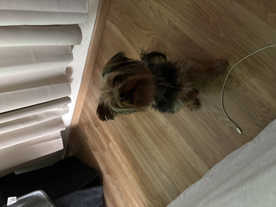 A small, brown Yorkshire Terrier rests on a light-colored, wood-look floor. The dog faces the camera with its head tilted slightly. To the left, white pleated curtains hang vertically. In the lower left corner, dark fabric is visible under the curtains. A white charging cable extends across the floor to the right of the dog. The lower right corner of the image shows part of a white curtain or sheet.