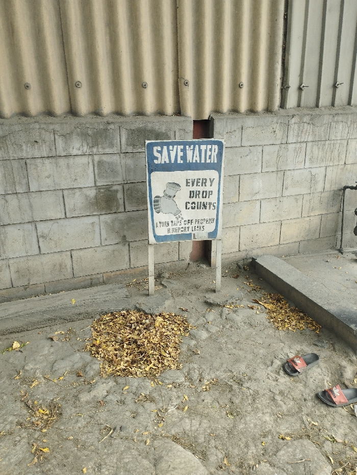 sign attached to a metal pole in front of a brick wall. The sign reads "Save Water, Every Drop Counts, Turn Taps Off Properly & Report Leaks". It is located in Ashaka, Nigeria at latitude: 10.929, longitude: 11.475. On the ground in front of the sign is a pile of dried leaves. There are two pairs of sandals on the ground to the right of the sign. The environment is dry and dusty.