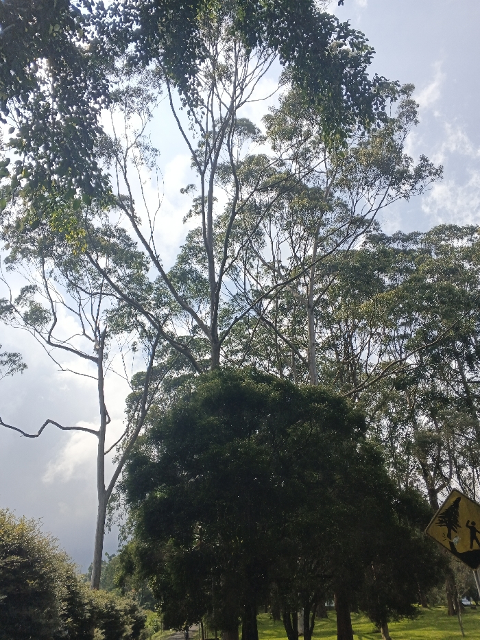 The image showcases a dense forest scene. Tall, slender trees with sparse foliage reach towards a sky marked by light clouds. A cluster of rounded, dark green trees occupies the foreground. A yellow pedestrian crossing sign is visible on the right, near the lower edge. Overall, the scene presents a natural, outdoor setting with a mix of tree types and a partially visible sky.