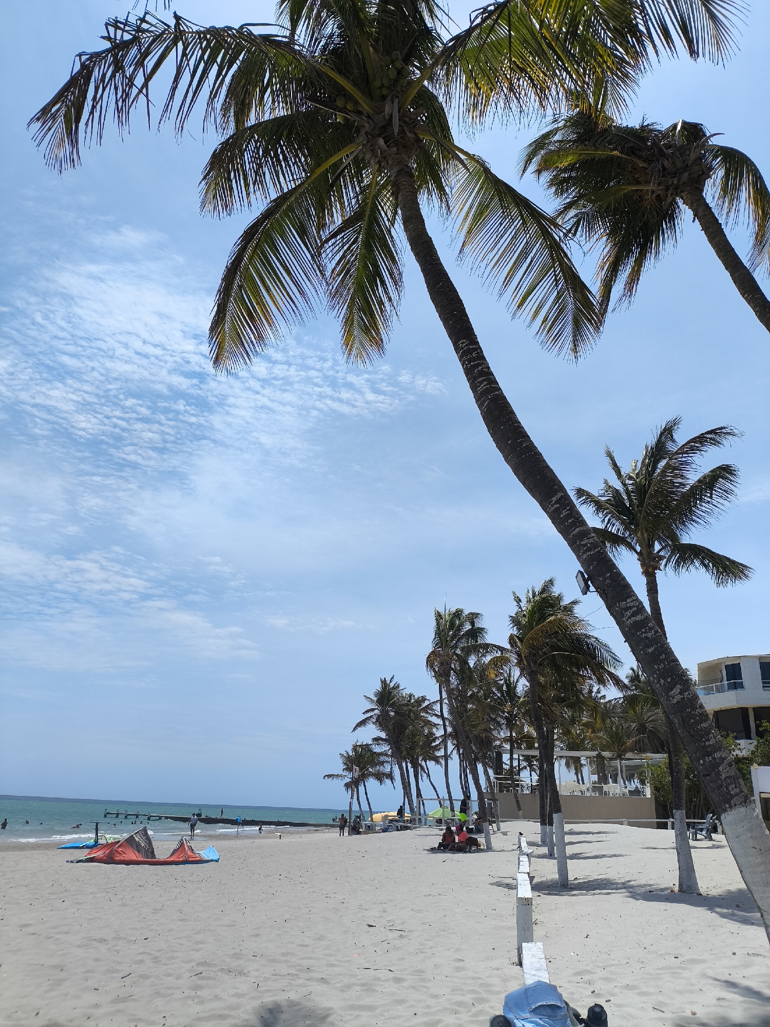 beach in El Yaque, Venezuela, under a partly cloudy, blue sky. Tall palm trees dominate the upper portion of the frame, their fronds swaying in the breeze. Below the trees, the sandy beach stretches towards the ocean, where a pier is visible in the distance. A few people are scattered along the shoreline, some swimming in the water near the pier. Colorful kites lie on the sand, indicating kite surfing activity. In the foreground, a white fence runs along a portion of the beach, and a baby stroller is sitting on the beach at the bottom edge of the frame. Further back, a building with white exterior is seen amongst the palm trees. People are also observed seated under palm trees along the beach.