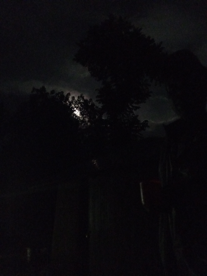 The scene depicts a nighttime outdoor environment in Borabu Chitago ward, Kenya. A partial moon is visible through the dense, dark foliage of multiple trees, serving as the primary light source against a cloudy sky. On the right side of the frame, a human figure stands in silhouette, holding a red-colored object, possibly a cup or small device, in their right hand. Additional indistinct dark structures are faintly discernible in the background.