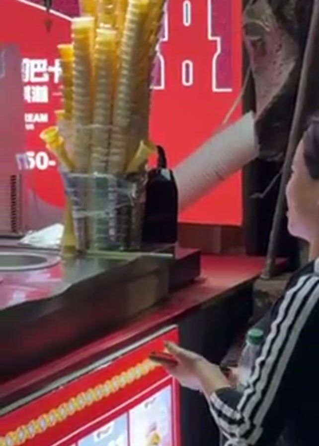 woman purchasing ice cream from a vendor. The vendor, wearing gloves and a decorative vest, uses a long metal tool to extract ice cream from a container and place it on a cone. The cones are stored in a tall, transparent bucket. The woman then receives the ice cream cone. The background features a red sign with Chinese writing and a drawing of a building. A small air conditioner sits near the ice cream station. The woman is carrying a white bag and a water bottle.