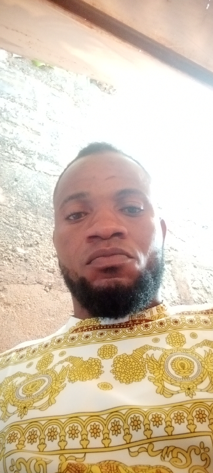 An adult male subject is depicted in a close-up, slightly high-angle portrait. He is of apparent African descent, with a dark complexion, short dark hair, and a full, dark beard and mustache. A subtle horizontal line or scar is visible on his forehead, above the right eyebrow. He is wearing a collared garment, likely a shirt or tunic, which features a white base fabric adorned with an intricate pattern of gold and yellow baroque-style scrolls and floral motifs. The subject maintains direct eye contact with the camera, exhibiting a neutral facial expression. The background to the left and behind the subject's head consists of a light-colored, textured wall, possibly concrete or stucco. A dark, linear architectural element, potentially a beam or overhang, spans the upper portion of the frame. Bright lighting, possibly natural, enters from the upper right, causing some overexposure in the background. The specific location in Nnewi, Nigeria, cannot be determined from the visual evidence within the image.
