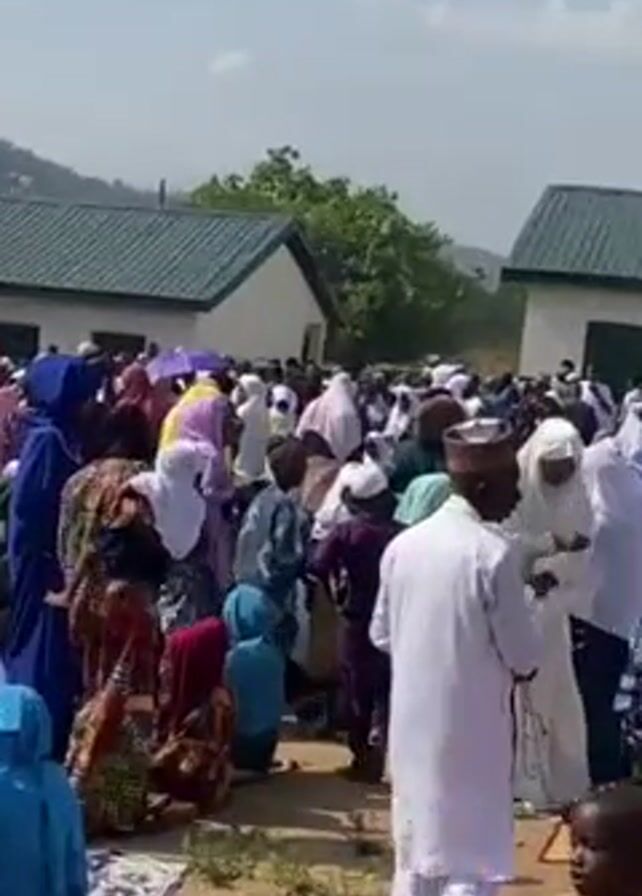 large group of people, including adults and children, gathered outdoors on a sunny day. Many are wearing traditional Muslim clothing, including headscarves and robes, in various colors. Some people are sitting on the ground, while others are standing and walking around. There are a few low buildings with green roofs visible in the background, as well as trees and a distant hill. The ground appears to be a dirt or grassy area. The overall scene suggests a gathering for prayer or a religious event.