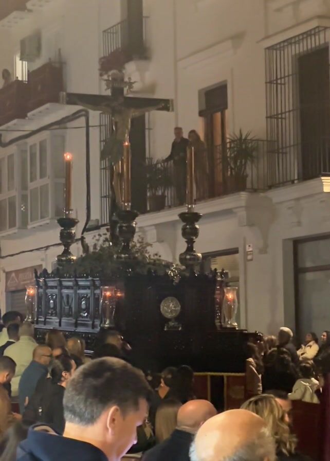 At night, a religious procession moves through a town. The large float carrying a figure on a cross moves slowly through the street as crowds of people watch from the ground and a balcony of an adjacent building. The cross is black with some decorative features on the base. People are dressed in casual clothing. The building is white with black shutters, and streetlights dimly illuminate the scene.