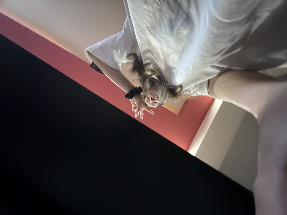 This image, captured in Galabovtsi, Bulgaria, presents a low-angle, upward-facing perspective of a female subject within an interior setting