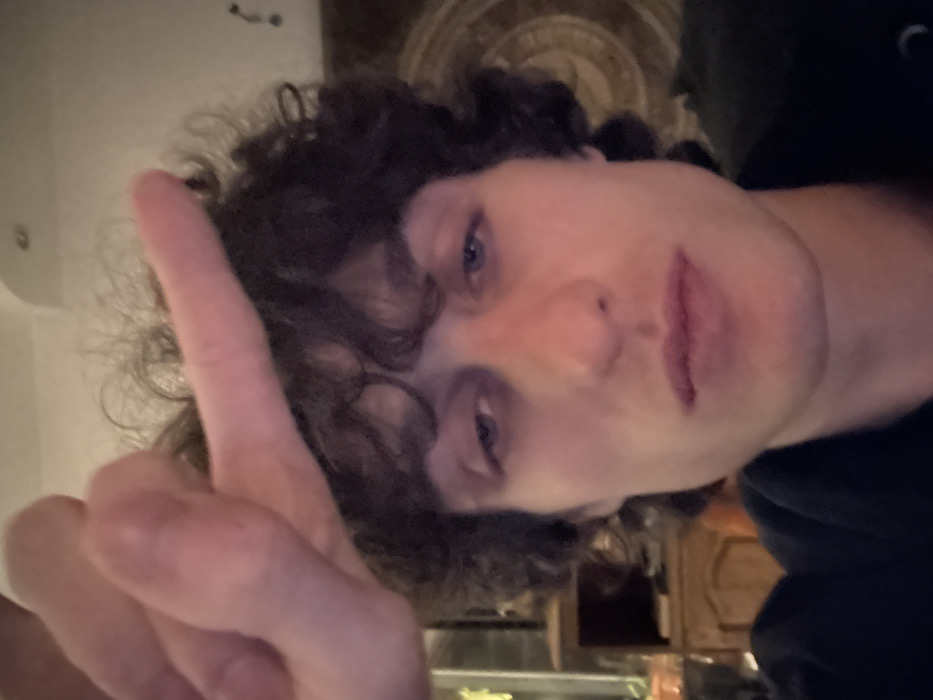 A young person with curly dark hair is photographed up close. The person is holding up their index finger in front of the camera. The person has light skin, blue eyes, and a slightly serious expression. The background is dimly lit with a circular pattern visible on the wall. The person is wearing a dark-colored top or hoodie. The photo is taken at an odd angle.