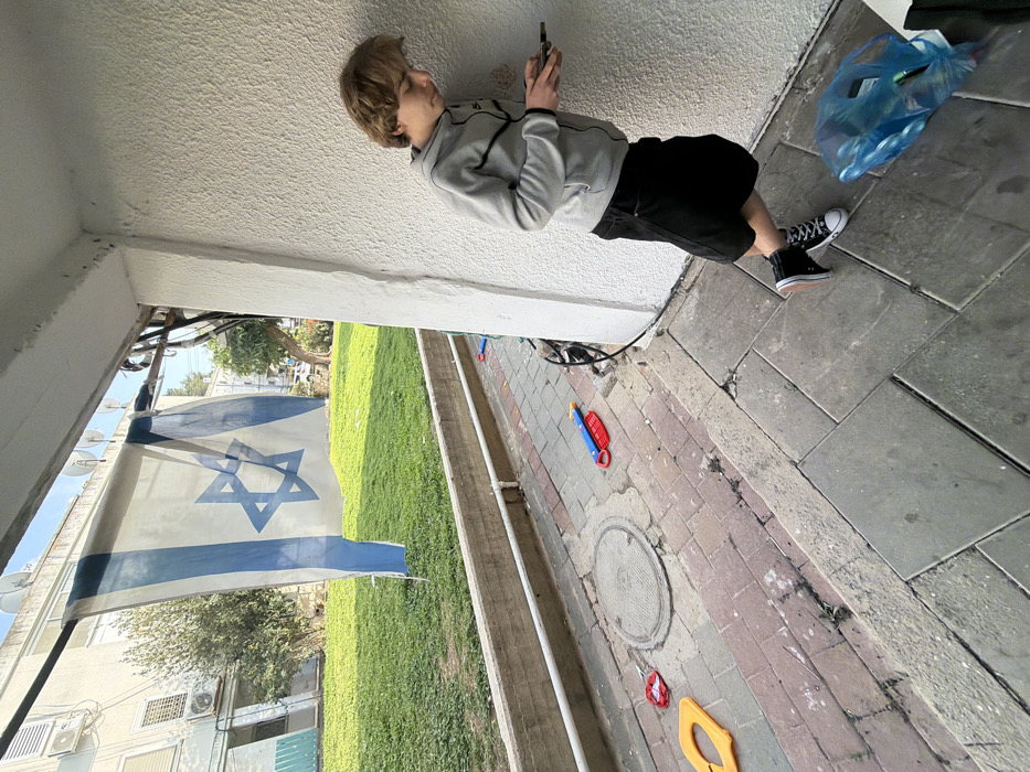This image captures an outdoor residential scene in Migdal HaEmeq, Israel, under clear daylight conditions. A young male, appearing to be in his late teens or early twenties, with light brown, wavy hair, is positioned in the right foreground. He wears a grey hooded sweatshirt, black shorts, and black high-top sneakers, leaning against a textured, light-colored wall while focused on a black smartphone held in both hands. To his immediate right, a blue plastic bag containing multiple water bottles rests on the grey tiled ground. Extending to the left and into the midground is a paved walkway composed of reddish and greyish bricks, which includes a circular metal manhole cover. Several brightly colored plastic children's toys (yellow, red, and a blue/red object) are scattered across this walkway. A low concrete wall, topped by a white pipe, delineates the walkway from a vibrant green grassy lawn. In the upper left-to-midground, a large, slightly worn Israeli flag, white with two blue horizontal stripes and a blue Star of David, is suspended horizontally from an overhead line. In the background, light-colored residential buildings with visible air conditioning units and multiple satellite dishes are present, interspersed with green trees and foliage, all under a clear blue sky.