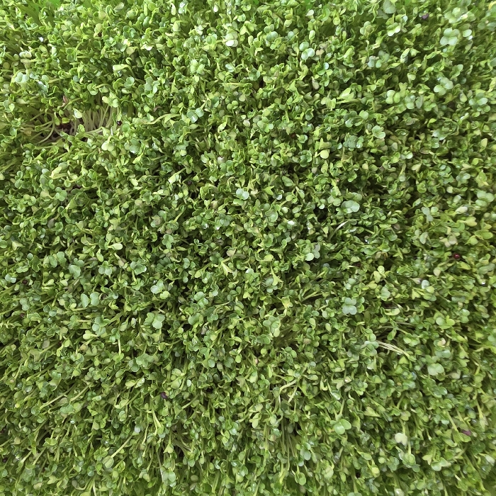 The image presents a dense, top-down perspective of a uniform growth of vibrant green microgreens