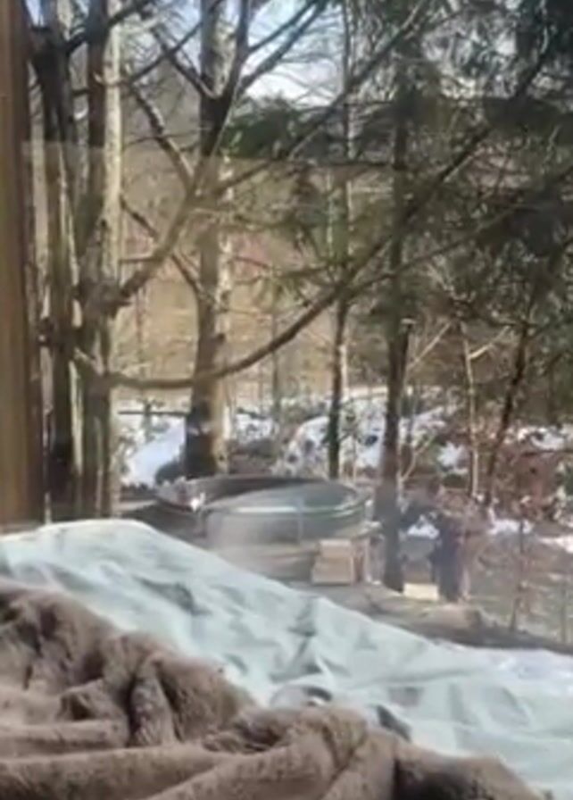 From an interior view, a person is seen outside through a window, loading wood into an external furnace next to a steaming hot tub. The hot tub is gray and round, situated on a wooden platform amidst snow-covered ground and trees, with a small red building visible in the background. The person loading the wood is wearing dark clothing and appears to be bending over to handle the wood pieces. The interior view shows a bed with blankets, conveying a cozy, indoor setting.
