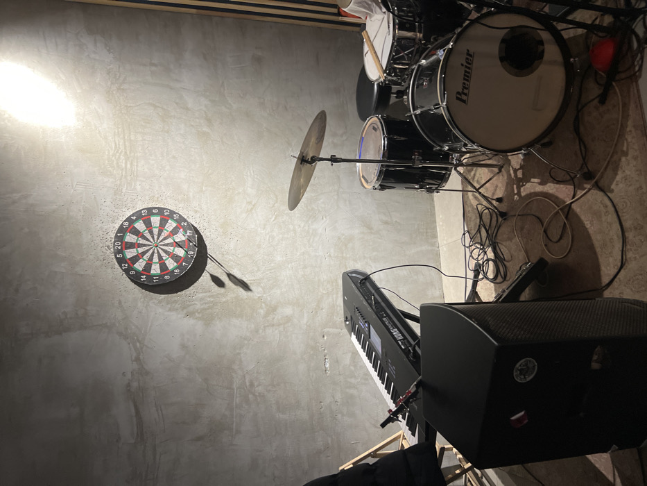 An indoor scene in Ovoshchnoy, Russia, features a musical practice or recreation area. The walls are light gray with a rough, textured finish, illuminated by a distinct overhead light source visible in the upper right. Centered on the back wall is a standard dartboard with two darts impaled: one in the number '3' segment and another directly below it, both casting elongated shadows to the left. To the left, a black Korg KROSS 88 synthesizer rests on a stand. In front of the synthesizer stand, a large black trapezoidal speaker cabinet is positioned on the floor, bearing multiple stickers on its front grill. A black Premier drum set is arranged on the right, comprising a bass drum, two tom drums (one floor tom, one mounted), a snare drum with two drumsticks resting on its rim, and a crash cymbal on a stand. A black drum stool is partially visible behind the drum set. Numerous power and audio cables are coiled and strewn across the light-colored, patterned rug covering the floor. A portion of a wooden folding stand or chair, draped with a dark jacket, is visible on the far left. No individuals are present in the scene.