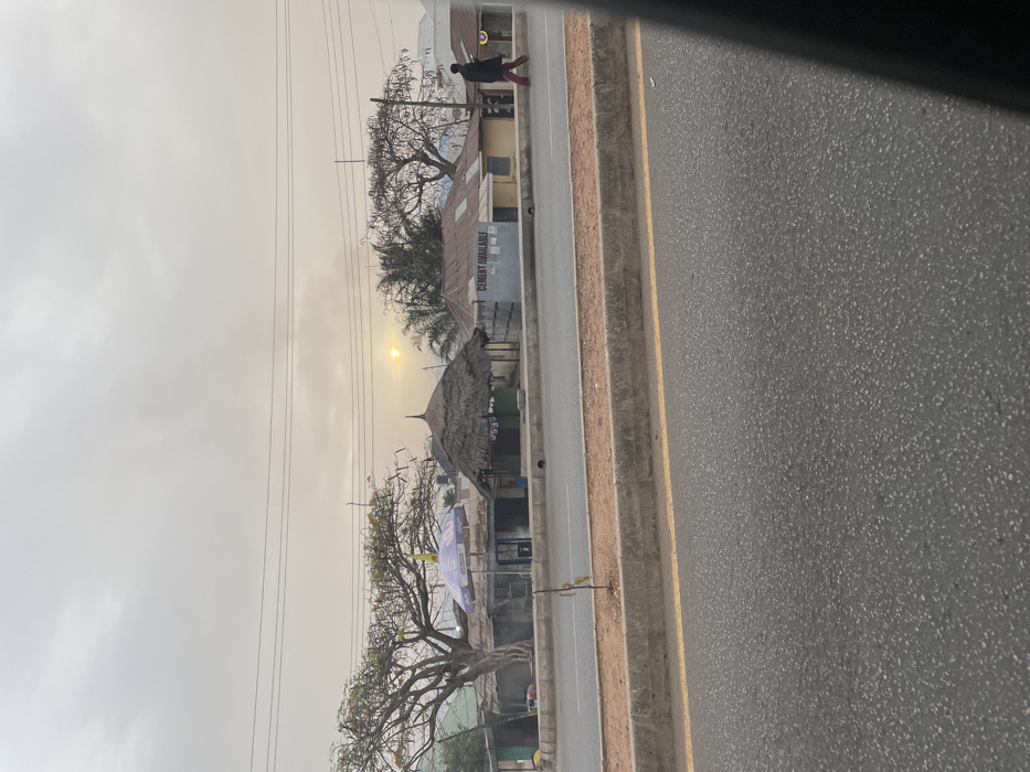 The image displays an outdoor street scene located in New Stadium, Nigeria, during daylight with a low, diffused sun visible through an overcast sky