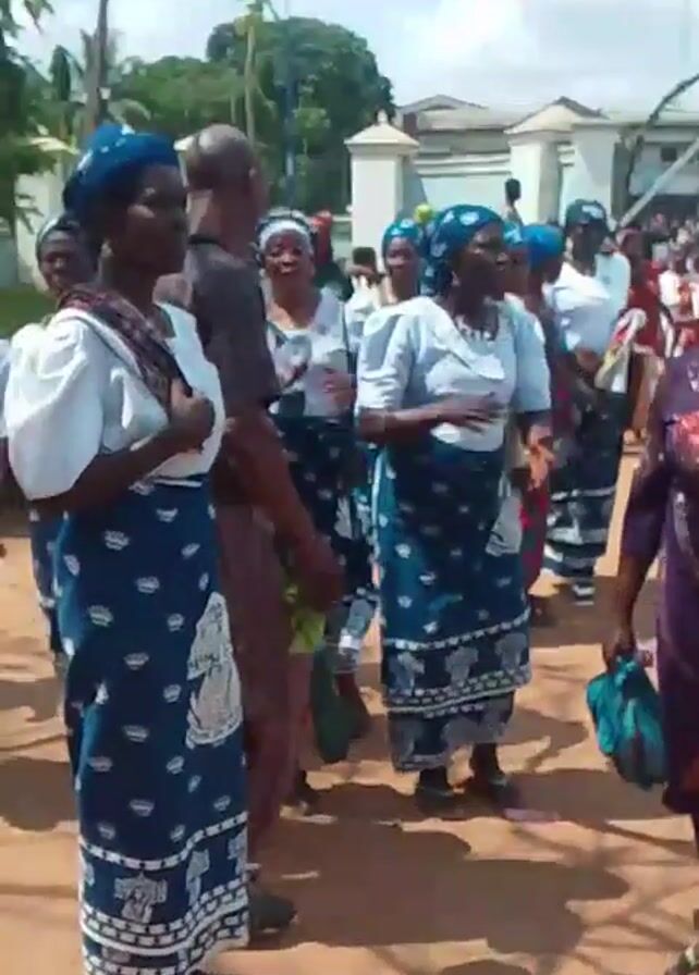 A group of people are walking and dancing in an outdoor setting on a sunny day. Many of the women are wearing matching blue and white skirts. Some men are wearing white outfits. There is a building in the background. The camera appears to be moving along with the group. There are trees, a light pole and other buildings in the distance. Music can be heard.