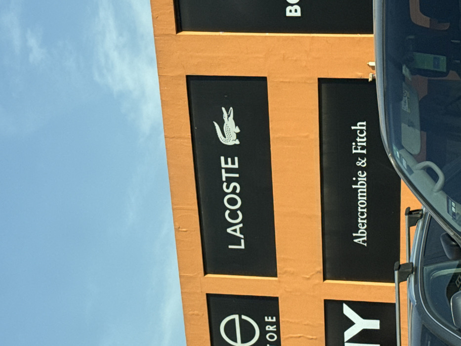 An exterior shot captures several store signs on an orange building. "Lacoste" is prominently displayed with its crocodile logo, situated next to an "Abercrombie & Fitch" sign. Partially visible are "B" and "E Store" signs. The view is partly obstructed by a vehicle on the right. Above the building, a clear blue sky is visible with some clouds.