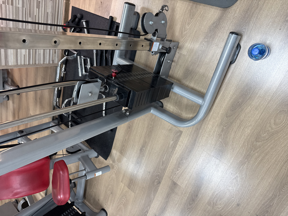 The image displays an interior view of a fitness facility in Bankya, Bulgaria. The foreground and midground are dominated by a grey-framed cable exercise machine featuring a stack of approximately ten rectangular black weight plates. A red weight selection pin is inserted into the weight stack. Two silver vertical guide rods run parallel to the weights, and black cables are connected to a pulley system visible on the right side of the machine. To the left, a portion of another grey-framed exercise machine with a red padded seat and backrest is visible. In the background, on a black rubber mat, several chrome-plated metal cable attachments, including various handles and bars, are scattered. The floor throughout the facility is light brown wood laminate. A small, clear plastic water bottle containing blue liquid and capped with a blue lid lies on its side on the laminate floor in the lower right foreground. The background wall features horizontal strips of light-toned wood or laminate paneling. No individuals are present, and no specific actions or interactions are depicted.