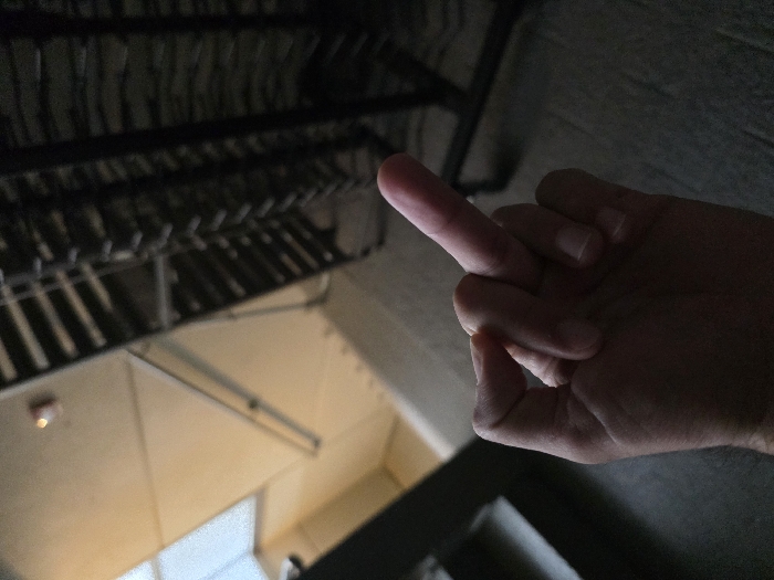 The image depicts a low-angle view within an indoor architectural space, likely a stairwell or atrium. In the immediate foreground and center, a human left hand is positioned, performing a "middle finger" gesture, with the extended digit angled slightly to the right. The hand exhibits fair skin tone and visible, short fingernails. The background to the left reveals a light-colored, angular ceiling and wall structure, possibly a soffit, with a bright area indicating a window or skylight allowing natural light. A metal handrail runs along a light-colored staircase or ramp on the left side. High on the left wall/ceiling intersection, a rectangular object, possibly a fire alarm sensor or smoke detector, is visible. To the right of the hand, the background is darker, showcasing a vertical structure composed of numerous dark, horizontal slats or bars, indicative of a metal banister or architectural screen for a multi-story staircase. The flooring visible beneath and around the hand is a dark, possibly tiled or concrete surface. The lighting suggests an interior setting with natural light entering from above and artificial light providing additional illumination, creating areas of both brightness and deep shadow. The specific location within Limassol, Cyprus, cannot be determined from the visual information provided.
