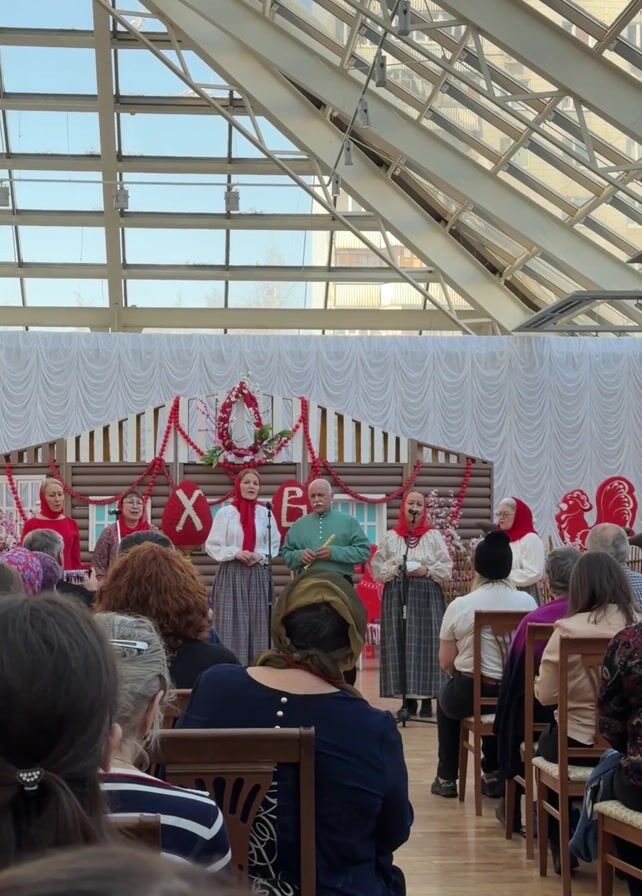 A choir of around seven adults, mostly women and one man, is performing for an audience in a hall with a high, partially-glass ceiling. The performers are on a stage, standing in front of a backdrop with the letters "ХВ" displayed prominently. The women are wearing traditional clothing, including headscarves, and the man is wearing a green shirt. They all have microphones. The audience is seated in rows of chairs, and most of the people are facing the stage. The hall is well-lit.