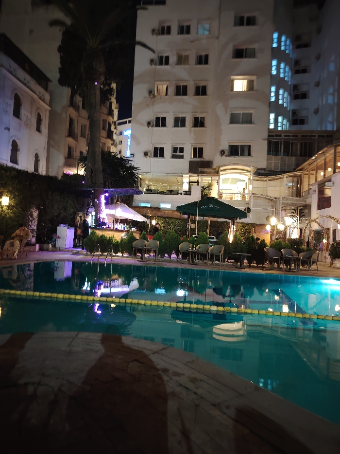 A serene nighttime scene features a swimming pool with vibrant turquoise water and a yellow safety line. The pool reflects the surrounding lights from a bar area with tables, chairs, and green umbrellas, creating a mirrored effect. Tall buildings flank the area, some with illuminated windows. The foreground shows part of a dark, patterned surface, likely the edge of the pool or a nearby platform.