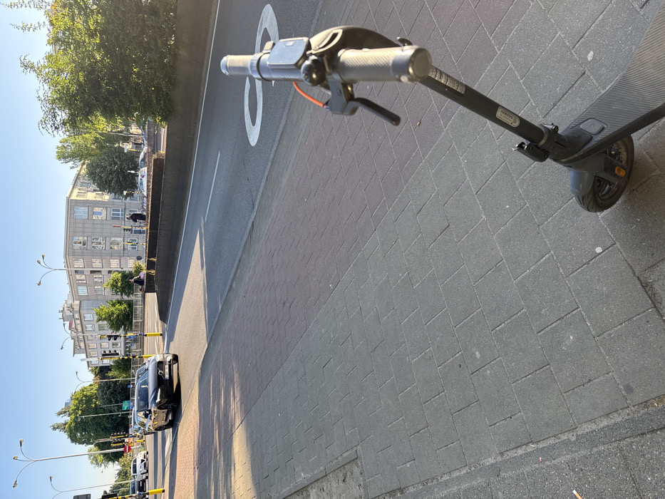 black electric scooter parked on the sidewalk in front of a building. The scooter is parked on the left side of the image, facing towards the camera. The image shows the handlebars and front wheel of the scooter. The handlebars have a black grip, and the front wheel is a black tire. The sidewalk is made of gray concrete blocks. The road is in the background. The road has a white circle in the middle of the frame. The circle is surrounded by a white line. The road is surrounded by a gray concrete curb on the left side of the frame. There is a car parked on the road in the background. The car is black with a white license plate. The car is parked on the right side of the road, facing towards the camera. There are several people walking on the sidewalk in the background, behind the scooter. They are all wearing dark clothing. There is a building in the background. The building is a white multi-story building. The building has windows and a flat roof. The building is surrounded by a green lawn. The image appears to have been taken in Antwerpen, Belgium, at the coordinates 51.19, 4.389, which corresponds to a public square in the center of the city. The image was taken at noon on a sunny day. The sky is blue. The sidewalk is clean. The road is clean. The scooter is in good condition. The car is in good condition. The people are walking in a casual manner. The building is well-maintained. The environment is peaceful. The image is a snapshot of everyday life in Antwerpen.