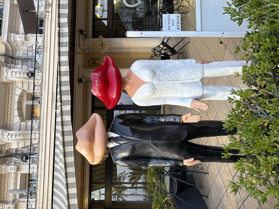 Two humanoid sculptures stand prominently in front of an ornate building in Nice, France. The sculpture on the left depicts a male figure wearing a glossy black suit and tie, with its head replaced by an oversized, smooth, light peach-toned pair of lips. The sculpture on the right portrays a female figure in a textured white V-neck top and matching trousers, with its head replaced by an oversized, glossy bright red pair of lips; two small white circular elements are visible on the upper red lip. Both sculptures feature light-toned hands. In the immediate foreground, a low hedge of green shrubbery partially obscures the lower sections of the sculptures. Behind them, a paved patio area is visible with dark metal chairs, some stacked or partially arrayed, suggesting an outdoor seating establishment. The background features a multi-story, classically styled building with a light-colored facade, ornate architectural details including decorative pilasters, cornices, and balconies with black railings. A grey and white striped awning extends over the ground-level patio. Large glass windows and doors reflect palm trees and reveal an interior with a chandelier. A monogram, possibly "RA" or "AR," is visible above the main entrance. To the right of the sculptures, a white sign states "SCULPTEUR RICHARD MAS" and a phone number "06 72 65 33 46."