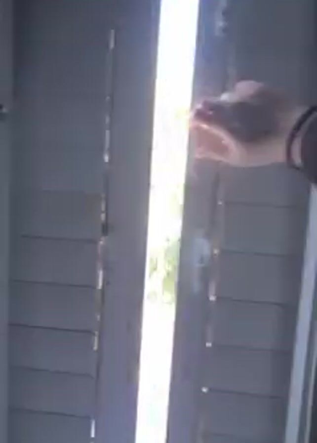 someone opening a security gate from the inside. The gate is made of vertical metal bars and is painted green. Behind the gate, there is a view of trees, a roof, and the sky. The person opening the gate is wearing a black sleeve. They slide the gate open to the left. The environment appears to be outdoors on a sunny day.