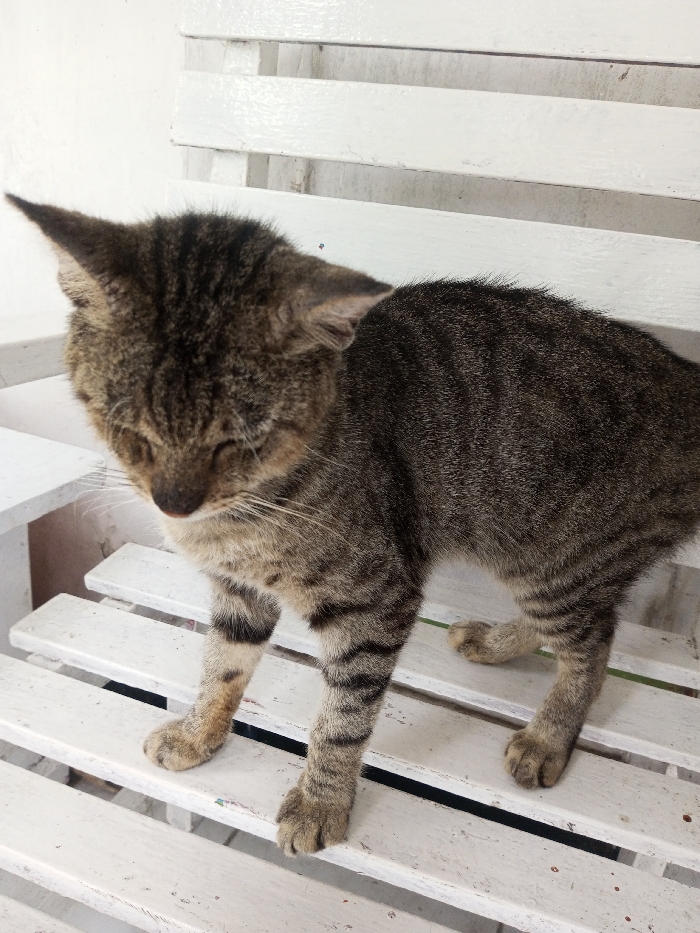 A skinny tabby cat with dark brown and grey stripes stands on a white wooden bench. The cat's eyes are closed, and it appears to be tired or unwell. The bench has horizontal slats and a white painted finish. The cat's fur is rough and stands up along its back. Its front legs are straight, and its hind legs are slightly bent. The background consists of more of the white painted bench and wall.