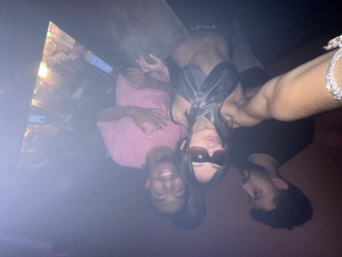 An indoor, low-light scene depicts five individuals in what appears to be a nightclub or bar, illuminated by ambient red-purple lighting and a strong flash/lens flare from the upper right. The image is a selfie captured from a slightly elevated perspective. In the foreground, a female with dark, medium-length hair, wearing large dark sunglasses, a grey satin-like cross-over halter top exposing her midriff, and dark bottoms with a metallic chain belt, poses with pursed lips. Her left arm, adorned with a silver bracelet, extends towards the camera, indicating she is holding the device. Behind her, to the left, stands a male with dark hair and a beard, wearing a black t-shirt, looking towards the right side of the frame. To the right of the female, another male with dreadlocks or long curly hair, wearing a pink t-shirt and multiple necklaces (including a prominent cross pendant and a "baby" pendant), smiles broadly at the camera with his right hand resting on his chest. A fourth individual, partially obscured by the man in the pink shirt, is visible in the background center-right. A fifth individual's dark head is barely visible between the bearded man and the man in pink. The background on the right reveals elements of a DJ setup, including what appears to be a console with various electronic equipment, cables, and possibly bottles or glasses. The precise location within the city of Paris cannot be determined from the visual information provided.