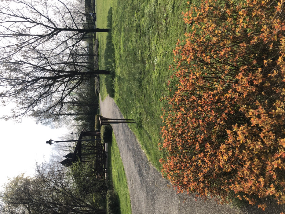 This image depicts a park environment in Rodano, Italy, under clear daylight conditions. The foreground features a dense bush with small, orange-red leaves, occupying the lower third of the frame. To the left of this bush, a light gray asphalt or gravel pathway curves from the lower left towards the upper center-left. Adjacent to the path on its right side, near the foreground bush, a wooden signpost stands upright. In the midground, a dark wooden gazebo with a multi-peaked roof is visible to the left of the pathway. Inside the gazebo, benches and a table are discernible. A tall, black lamppost with a classic design stands near the gazebo, to the right of it. The area surrounding the path and gazebo consists of green grass and various shrubs. Further into the midground and right, a large expanse of green grass dominates. Two deciduous trees with bare, dark branches are prominent in this grassy area, with patches of new green growth visible around their bases. In the far background on the right, two indistinct figures are seated on a bench, partially obscured by distant foliage. The background consists of numerous trees, some with new green leaves and others still bare, under a bright, slightly hazy sky. Shadows are consistent with a sunny day.