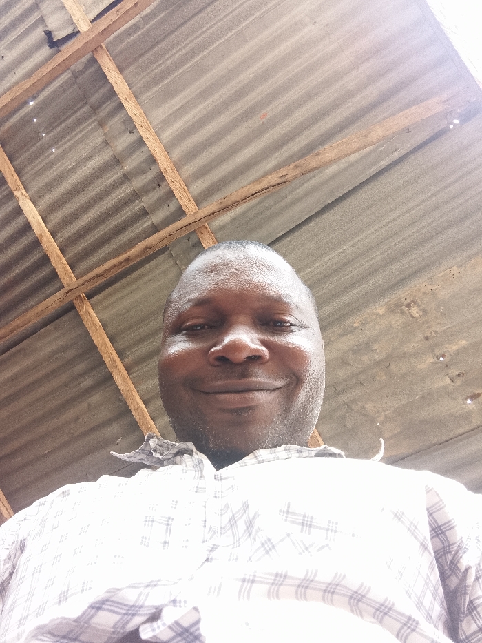 A low-angle close-up features a dark-skinned adult male with short dark hair, dark eyes, and facial stubble, smiling directly at the camera. He wears a light-colored, plaid button-down shirt. Above and behind him, a weathered grey corrugated metal roof structure is visible, supported by a network of rough wooden beams. Bright overhead light source creates reflections on the roof and the subject's forehead. The scene is located within an enclosed or sheltered area in the city of Unknown, Unknown.