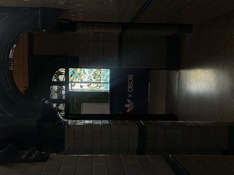 The image depicts an interior view of a tiled corridor leading into a brighter room, identified as Victoria Baths in Manchester, United Kingdom. The foreground corridor walls are clad in cream-colored rectangular tiles with dark green horizontal bands and decorative trim. A prominent dark green tiled archway frames a view into the adjacent room. Centrally, a multi-paneled stained-glass window is visible, featuring a vibrant floral and botanical motif with red flowers, green foliage, and blue elements, allowing a strong beam of natural light to penetrate and illuminate a section of the speckled terrazzo floor. Above this window, an ornate arched section of smaller, frosted stained glass with floral patterns is present. Below the main stained-glass window, a doorway opens into the next space. Across this opening, a dark blue partition or banner displays the white text "adidas x asos", indicating a brand collaboration or event. The scene is devoid of people. The lighting is dim in the foreground corridor, contrasting sharply with the illuminated area beyond the archway and the light streaming through the stained-glass window, which casts a bright streak on the floor. Architectural details like the decorative tiled archways and the distinct tiling pattern are characteristic of the historic Victoria Baths.