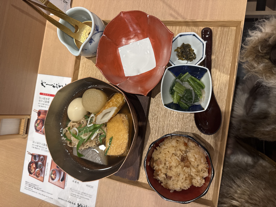 A wooden tray holds a Japanese meal. A dark bowl of oden, with boiled eggs, daikon radish, and tofu, sits next to a leaflet. Above it, a red lotus-shaped bowl with a white square inside. To the right, small square dishes contain pickled vegetables. A small bowl of cooked rice sits at the bottom right. A small pitcher with golden utensils and a dark spoon complete the set. The table is wooden, and fur is visible on the right edge.