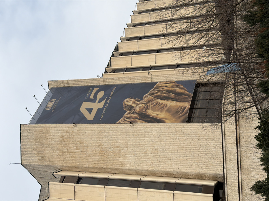 The image depicts the exterior of the National Palace of Culture (NDK) building in Sofia, Bulgaria, characterized by its beige, textured concrete panel facade and angular, Brutalist architectural style