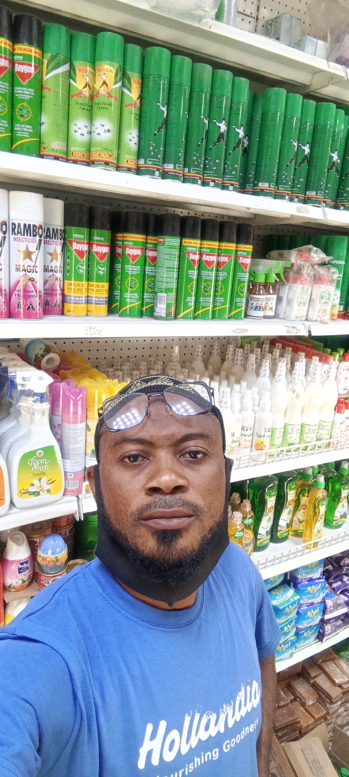 An adult male is depicted in a close-up, selfie-style indoor portrait taken in a retail establishment in Sani Mai Nagge, Nigeria