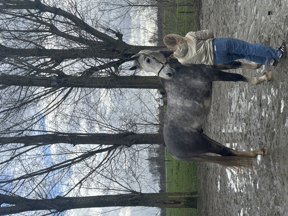 The scene is an outdoor, rural environment located in Estaimpuis, Belgium, characterized by a muddy, wet ground surface with visible puddles. One individual, appearing female, is present, positioned with her back to the camera, facing the left flank of a dapple grey horse. She is wearing a light-colored, possibly beige or metallic, hooded jacket, blue jeans, and dark athletic shoes with white stripes. Her hands are positioned near the horse's neck/shoulder area. The horse, a dapple grey, stands facing slightly left, equipped with a dark bridle or halter. In the background, multiple tall, bare deciduous trees with dark trunks stand against an overcast sky. Beyond the immediate muddy foreground, a green grassy field is visible, bordered by a fence line. In the distant left background, a building with a distinct dark spire, indicative of a church or bell tower, is discernible.