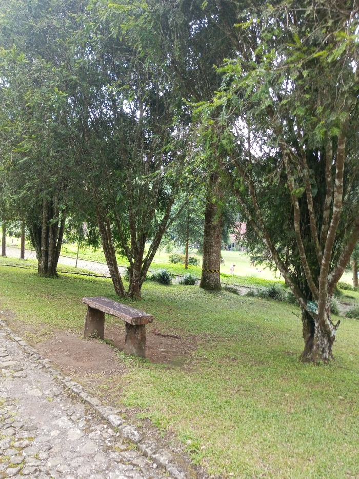 The scene depicts a park or garden located in Cimacan, Indonesia, viewed under diffused natural light. A rough, irregular stone-paved pathway extends along the lower left quadrant of the frame. Adjacent to this path, in the left-midground, rests a rustic, rectangular stone bench composed of light-colored blocks, situated on an area of bare earth. Beyond the path and bench, the ground is covered by well-maintained green grass. Numerous trees with green foliage and visible trunks populate the area, forming a partial canopy and varying in density. Several tree trunks exhibit lichen growth. A distinct tree in the mid-ground, slightly right of center, features yellow and black striped tape wrapped around its trunk. Another tree in the immediate foreground on the right has a small green sign affixed to its trunk. In the distant background, through the trees, a light-colored structure with an orange or red roof is partially visible, and a single, indistinct human figure is observed standing on the distant grass. No explicit actions or interactions are in progress.