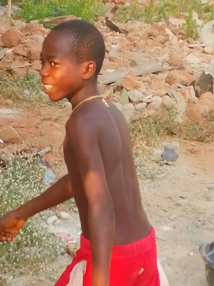 A young male child, estimated to be between 5 and 10 years old, with dark skin and short, dark hair, is depicted in a brightly lit outdoor scene in Enugwu-Ukwu, Nigeria