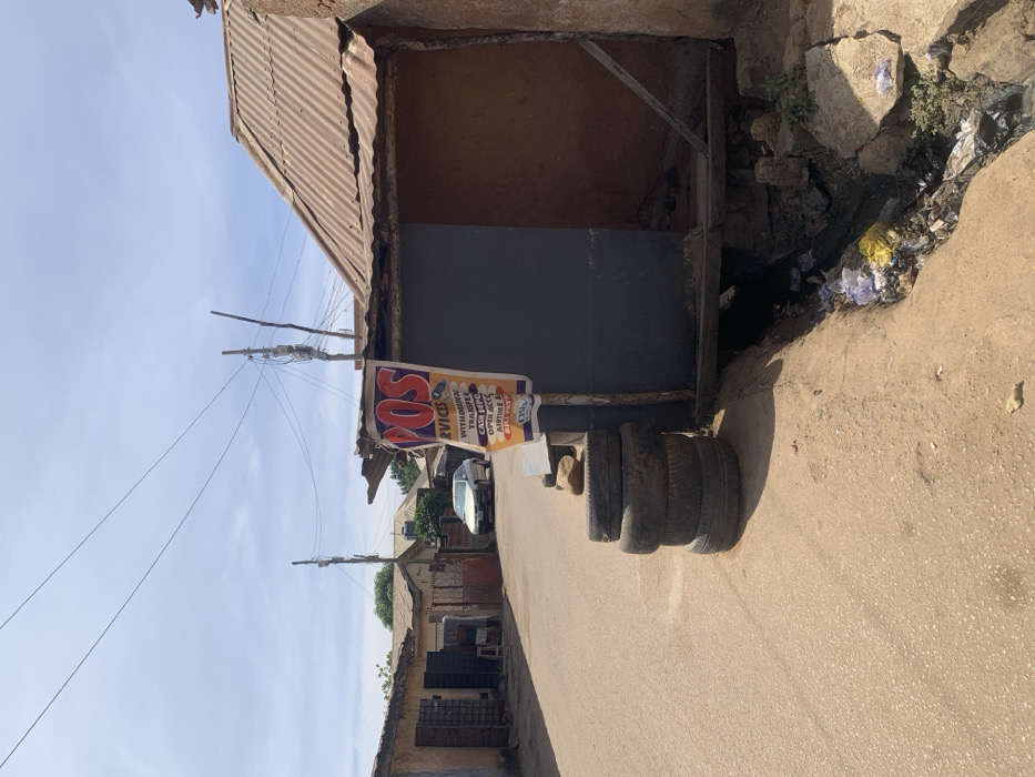 This image presents a street scene in Jos, Nigeria, observed under a clear blue sky with sparse white clouds. In the immediate foreground on the right, a small, single-story structure features a rusty, corrugated metal roof. Its front wall is partially dark grey and partially an unpainted reddish-brown. A faded red and white banner advertising "POS SERVICES" for "WITHDRAWAL, TRANSFER, CASH DEPOSIT, OPEN ACCOUNT, AIRTIME & BILL PAYMENT," along with a "DStv" logo, is affixed to the structure's front. To the left of this structure, four dark, used vehicle tires are stacked vertically on the edge of the paved road, with a single rock resting on the uppermost tire. Below the structure, an open, unlined drainage channel runs parallel to the road, containing scattered refuse and plastic debris. The paved road, appearing dusty and worn, recedes into the midground, where a light-colored sedan is visible. On the left side of the street, a series of single-story buildings with corrugated roofs and varying facades, including dark shutters or doors, line the roadway. Overhead, multiple utility poles support a network of electrical or communication wires. No individuals are visible within the frame.