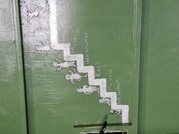 A weathered, dark green painted door, located in Nova Zagora, Bulgaria, is depicted in a vertical orientation. A black, curved door handle is partially visible on the far left edge. The central subject is a white chalk or paint drawing illustrating a six-step staircase ascending from bottom-left to top-right. Seven stylized, stick-figure-like human figures are positioned along and above this staircase, each representing a stage of progress. From left to right along the ascent: 1. A figure sits on the ground below the first step, accompanied by the Bulgarian text "Не искам" (I don't want to). 2. A second figure sits on the first step, next to the text "Не мога" (I can't). 3. A standing figure is on the second step, with the text "Как?" (How?). 4. A standing figure with outstretched arms is on the third step, alongside the text "Ще опитам" (I will try). 5. A standing figure with arms raised in a triumphant pose is on the fourth step, above the text "Мога" (I can). 6. A figure appears to be running or jumping on the fifth step. 7. A seventh figure is depicted airborne and inverted above the top right section of the staircase, with limbs splayed. The green paint on the door exhibits vertical drip marks and localized wear.