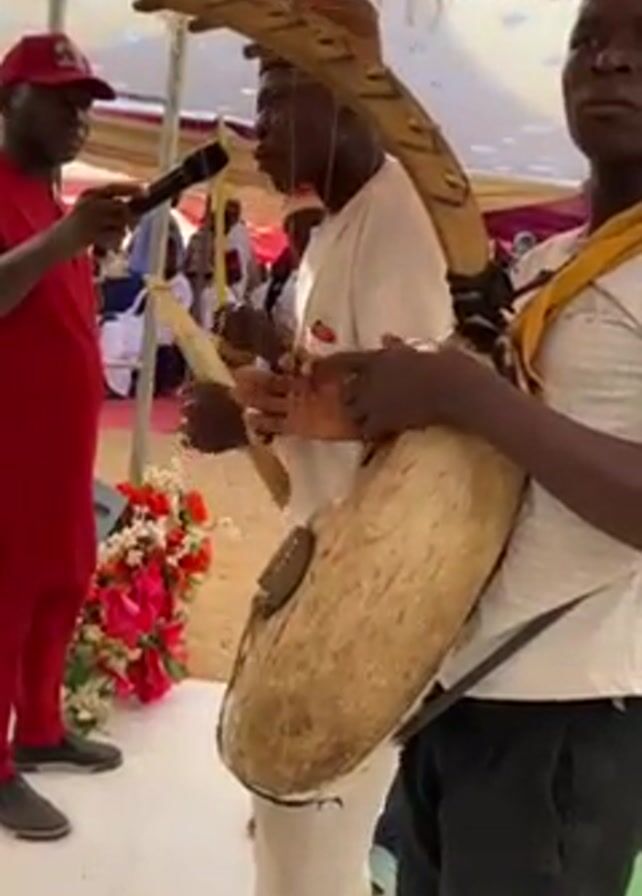 A recording shows three African men standing indoors. The man on the left wears a red cap and a red top, holding a microphone. In the center, a man in a white outfit and hat plays a traditional stringed instrument while singing. A third man stands to the right, holding the other end of the instrument. The background includes a tent-like structure adorned with white and gold decorations, and seated people can be seen in the distance. A bouquet of flowers sits on a step.