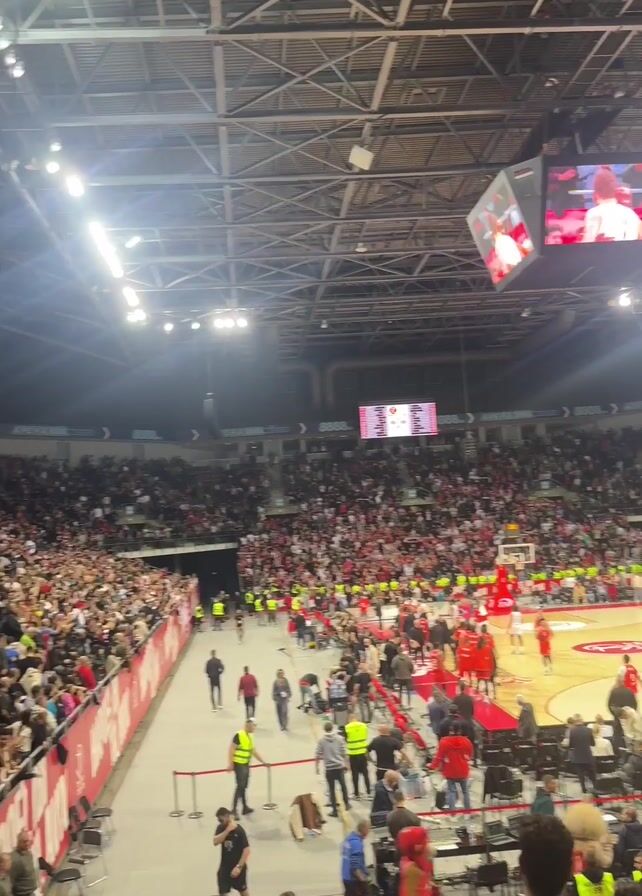 crowded basketball arena, likely just before or after a game. The court is visible with players and staff milling around. The stands are packed with spectators, and large screens display game footage. The arena's ceiling structure and lighting are visible, along with advertising. People in the crowd are sitting, standing, and moving around.